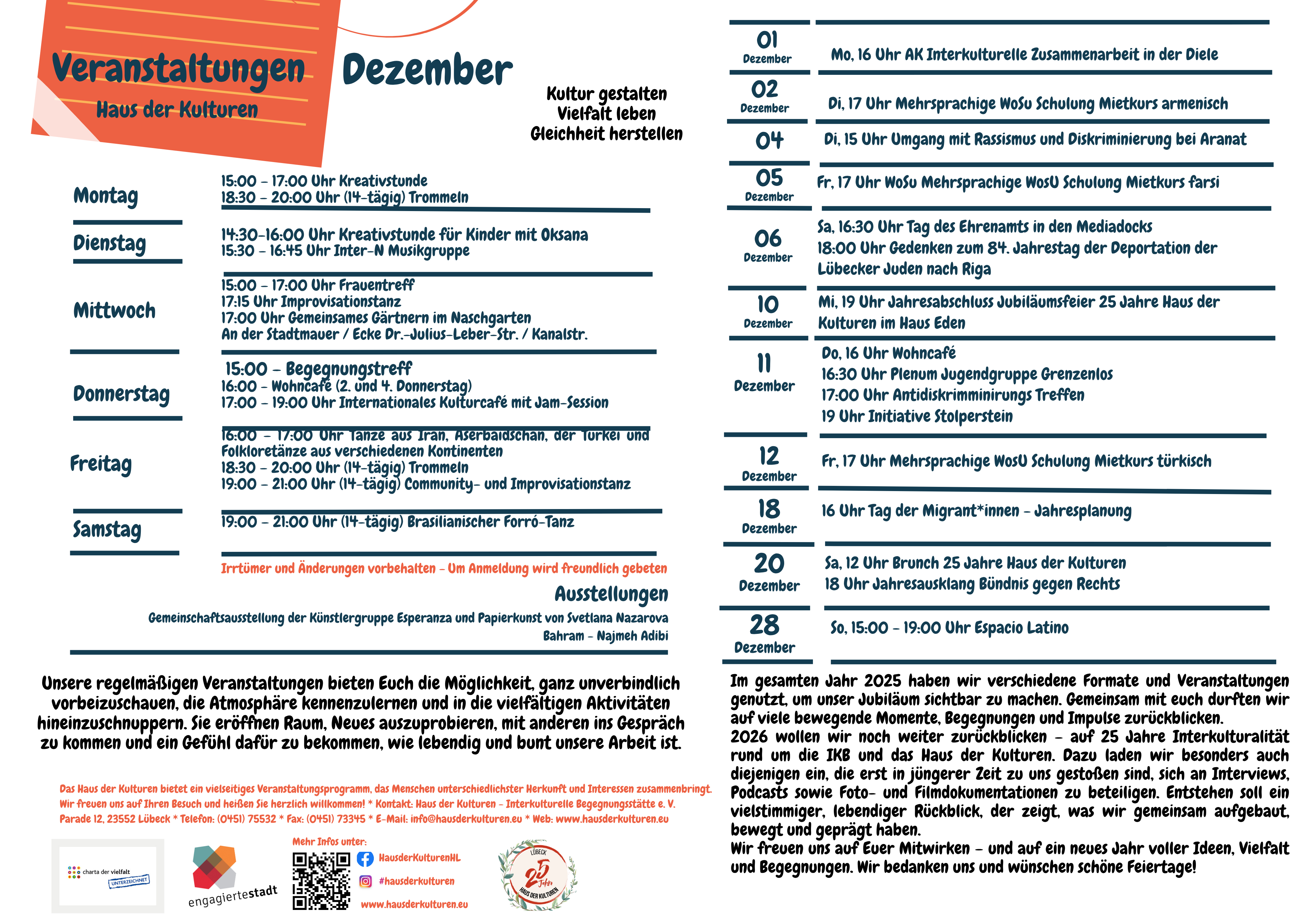 Mit Kunst- und Dokumentarausstellungen, Musik, Tanz, Filmen, Vorträgen, sowie praktischen Hilfen, wie Rechts- & Sozialberatungen und Sprachkursen, bietet unser Verein als Träger des soziokulturellen Zentrums „Haus der Kulturen“ und Projektträger allen in Lübeck lebenden Menschen den Rahmen, eine lebendige Begegnung und das Zusammenleben in der Stadt aktiv zu gestalten.