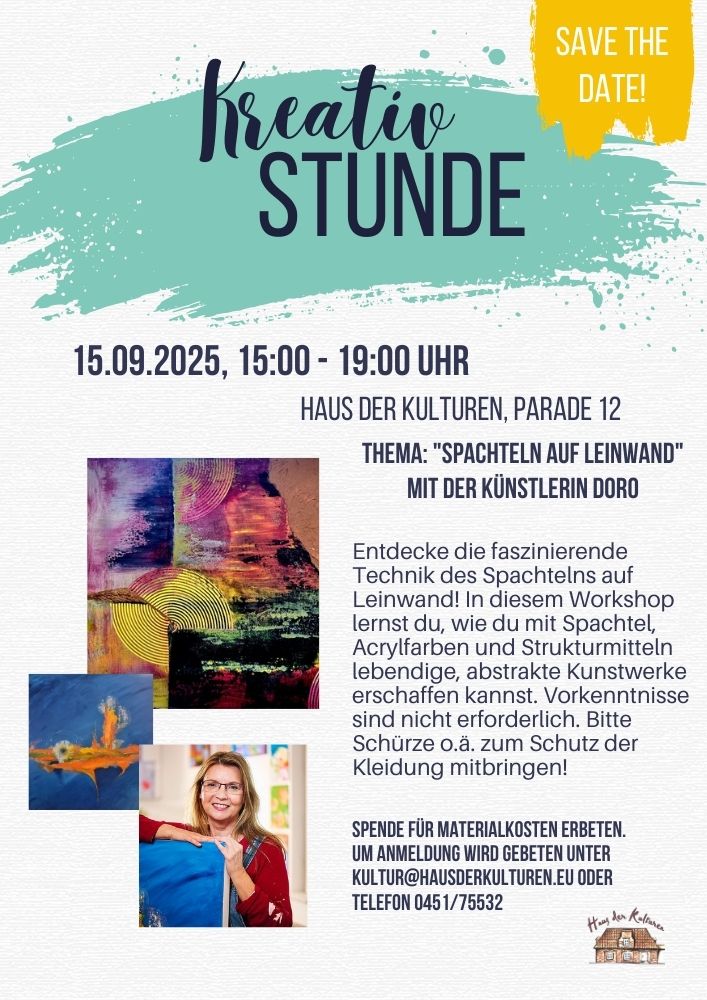 Entdecke die faszinierende Technik des Spachtelns auf Leinwand! In diesem Workshop lernst du, wie du mit Spachtel, Acrylfarben und Strukturmitteln lebendige, abstrakte Kunstwerke erschaffen kannst. Vorkenntnisse sind nicht erforderlich. Bitte Schürze o.ä. zum Schutz der Kleidung mitbringen!